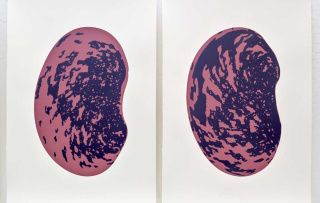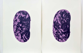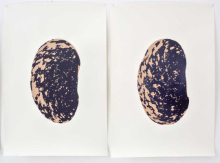 Die „Schwabenbohnen“ aus dem Saatgut meiner Eltern stammen ursprünglich von einem Bauernhof mütterlicherseits nahe Bad Buchau und wurden ununterbrochen bis 2020 angebaut. Wir Kinder waren sehr oft bei der Ernte mit dabei und waren immer gespannt, welche Farben aus den getrockneten Hülsen herauskommen würden. Fünf Bohnen habe ich aus der „Letzten Ernte“ ausgesucht, fotografiert und botanisch genau mit Siedrucktechnik verewigt. Man sieht, daß jede Bohen einzigartig ist, in Form, Farbe und Muster.